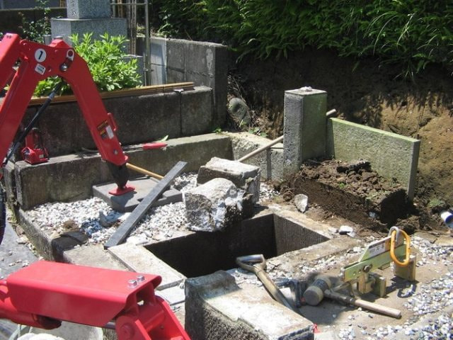 墓地の返還・墓所の移転の際にはご使用の墓所を更地にしてから墓地管理者に返還します。設置してある墓石や外柵を含めて解体・撤去工事を行います。今まで大切なご先祖をご供養されてきた墓所、作るときと同じように丁寧にすることが大切です。解体工事についても周囲の墓地に配慮をした丁寧な工事をすることを心がけております。