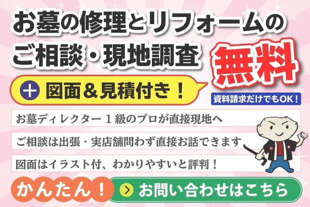 お墓の修理リフォーム工事にはどんなものがあるのでしょうか?ここではお墓の問題点とその原因に応じてどんな修理・リフォームが可能なのか、またその費用はどの程度なのかをご紹介します。