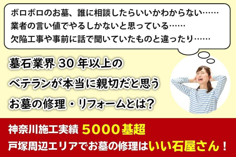 横浜市戸塚区にある有限会社石善運営「いい石屋さんサイト」にご来訪頂きありがとうございます。当サイトは「お墓の修理」で悩んでいる方のお役に立てればと思い作りました。