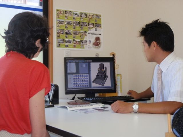 実際に基本的な墓石の形状や石材の見本をご覧になることができますが、お客様の墓所に合わせたオーダーメードのお墓を設計することができます。最新の墓石専用3次元CADを使用した、わかりやすいカラー図面を即時にプリントすることができますので、比較検討がしやすく好評です。