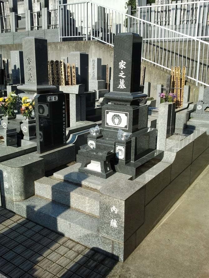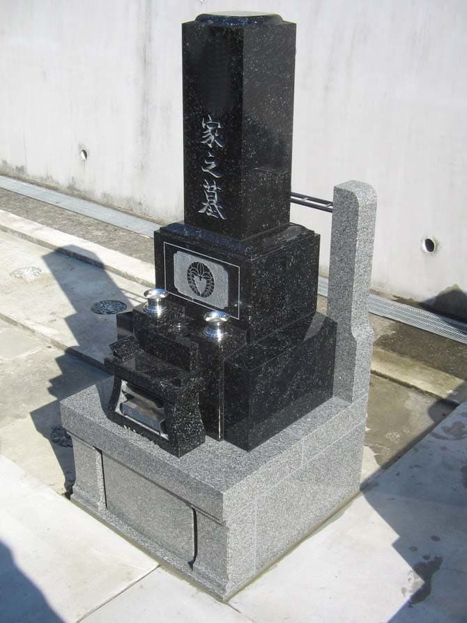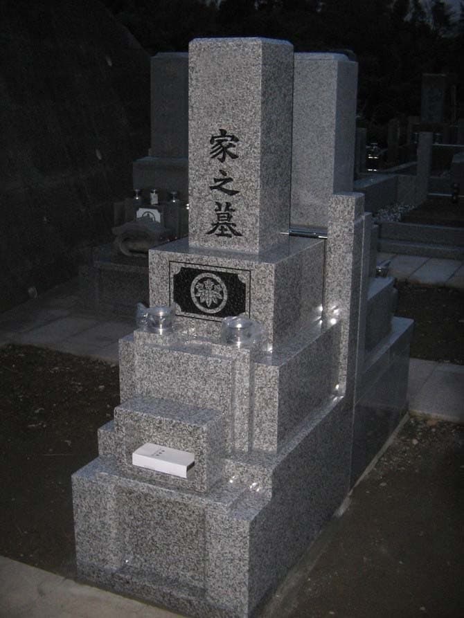 家名と家紋を特別に目立たせて欲しいというご要望をもとに製作したお墓です。グレー系の石材を使用してあるので白いペイントが無くても文字の認識はできますがご要望により白以外もペイントできます。