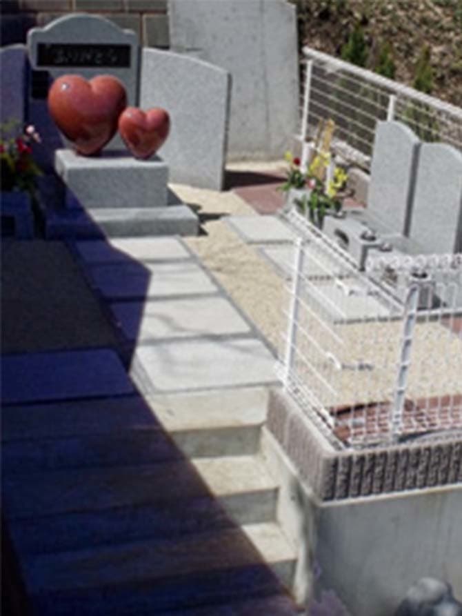 ペット霊園の墓石工事です。ハート型の赤い御影石が特徴で、背面の板碑は墓誌になっています。