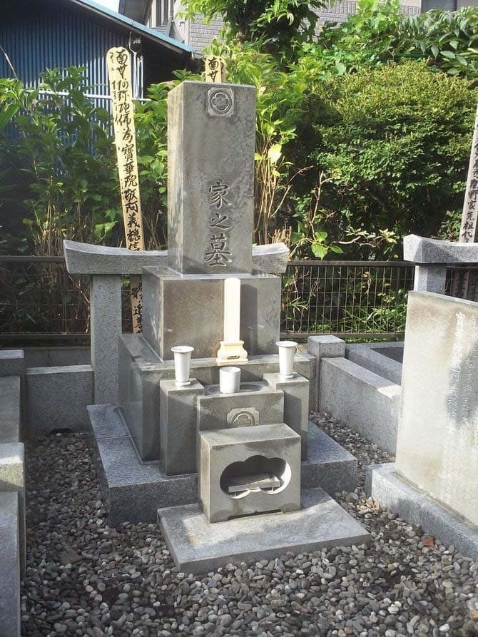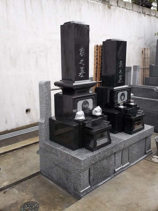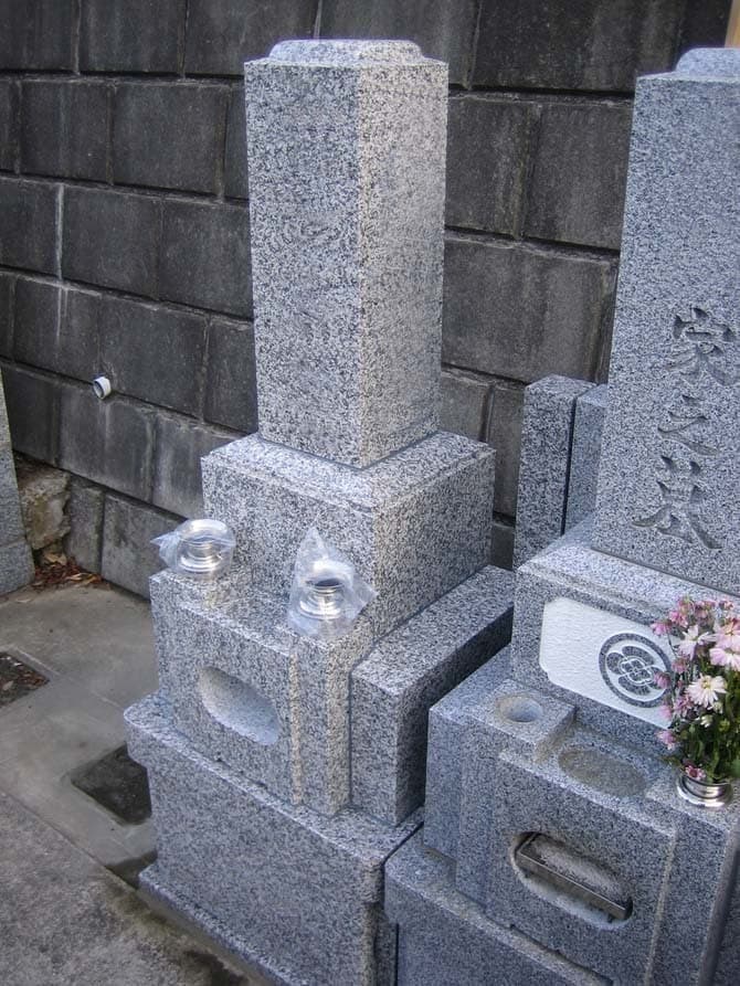 既に外柵が完成した墓所にて、カロートと石碑を新規にお作りした施工例。墓石にはインド産のグレー系御影石を使用したこだわりのお墓です。