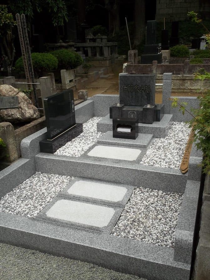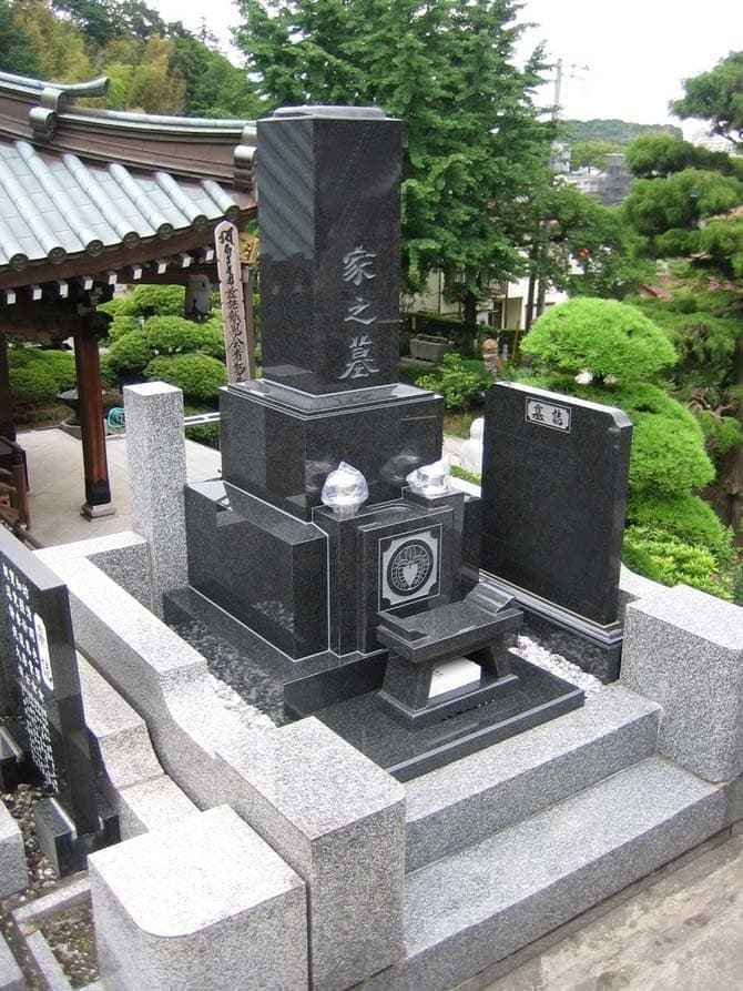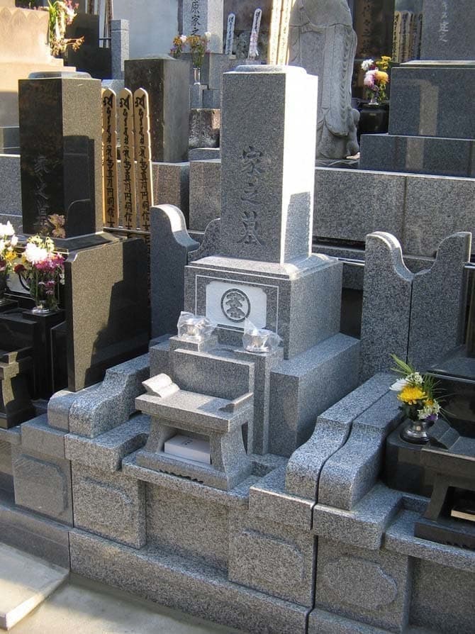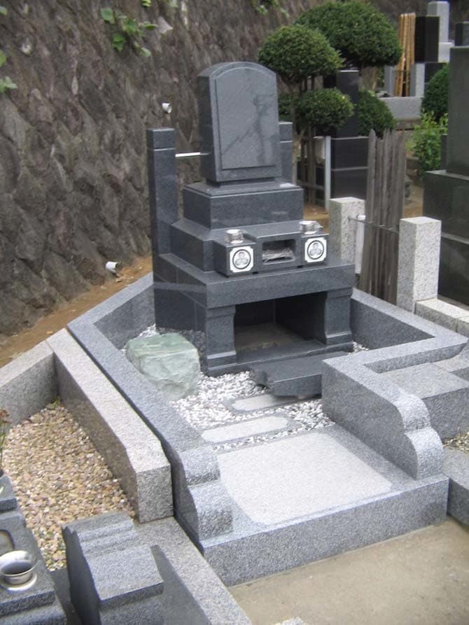 小面積の墓所用、丘カロート外柵のお墓です。外柵には中国産粗目石を使用し、石碑はインドのグレー系の石です。スリンという座布団のような形の石を追加した堂々としたお墓。