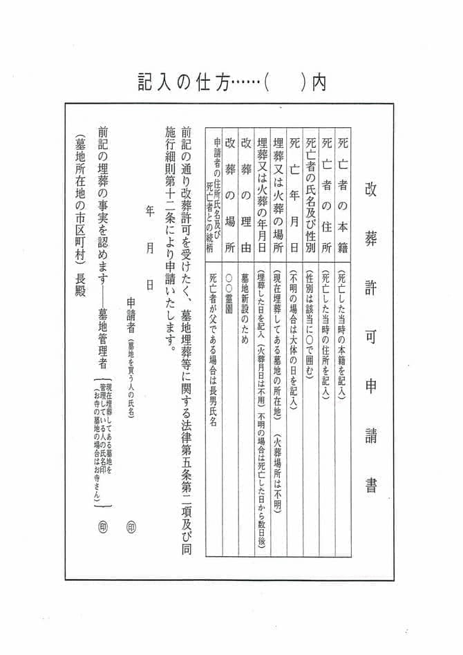 - 改葬許可の申請は各市町村により若干ことなるので必ず事前に移転元(郷里のお墓)を管轄する役所にお問い合わせください。