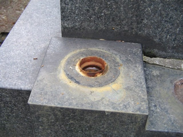 破損した花立を台座から撤去し、ステンレス製の台座を設置するためにドリルで穴あけ後セメントで接着して設置。頑丈でお水がたっぷりと入るお花立に生まれ変わりました。