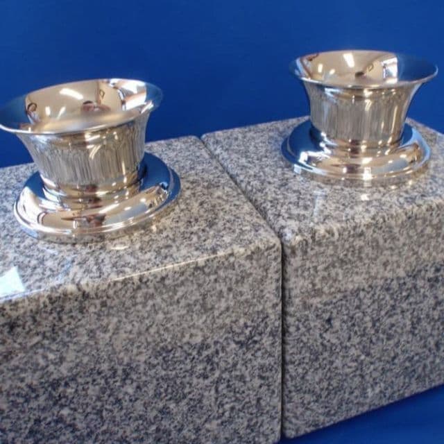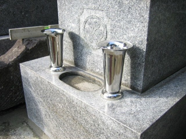 【花立】最近では錆びにくく頑丈なステンレス製のお花立が多く使用されており、ネジ式の様に取り外しが困難なものではなく、石に穴をあけて落とし込む形式が人気です。古いお花立ては撤去し、新しいお花立て用の穴を開けてセメントや接着剤で取り付け工事を行います。