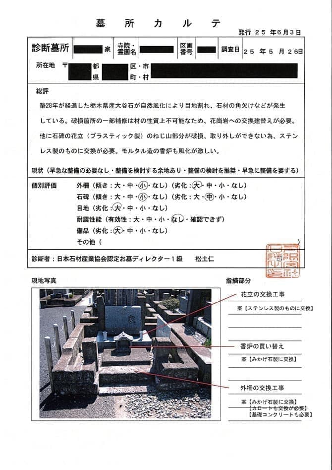 後日お墓の現状をわかりやすく判定した「墓所カルテ ※」(チェックシート)か墓所工事見積書、CAD図面を提出いたします。現地調査や初回提案図は無料ですのでご安心ください。